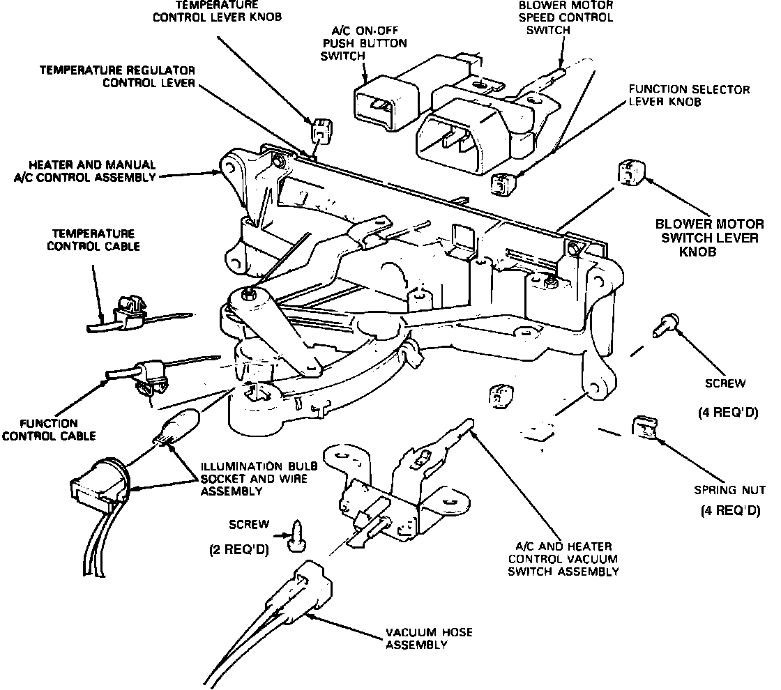1. Remove instrument panel center finish panel. Remove control knobs from control assembly by placing a small screwdriver between knob spring retainer and control assembly. Then pull screwdriver, applying pressure on spring retainer, and pull knob off control shaft.