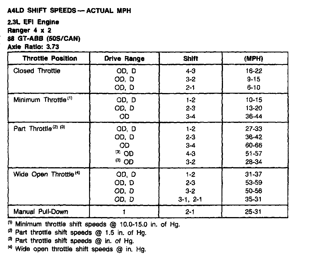 A4LD 4-spd A/T, Shift Speeds (2.3L Ranger):