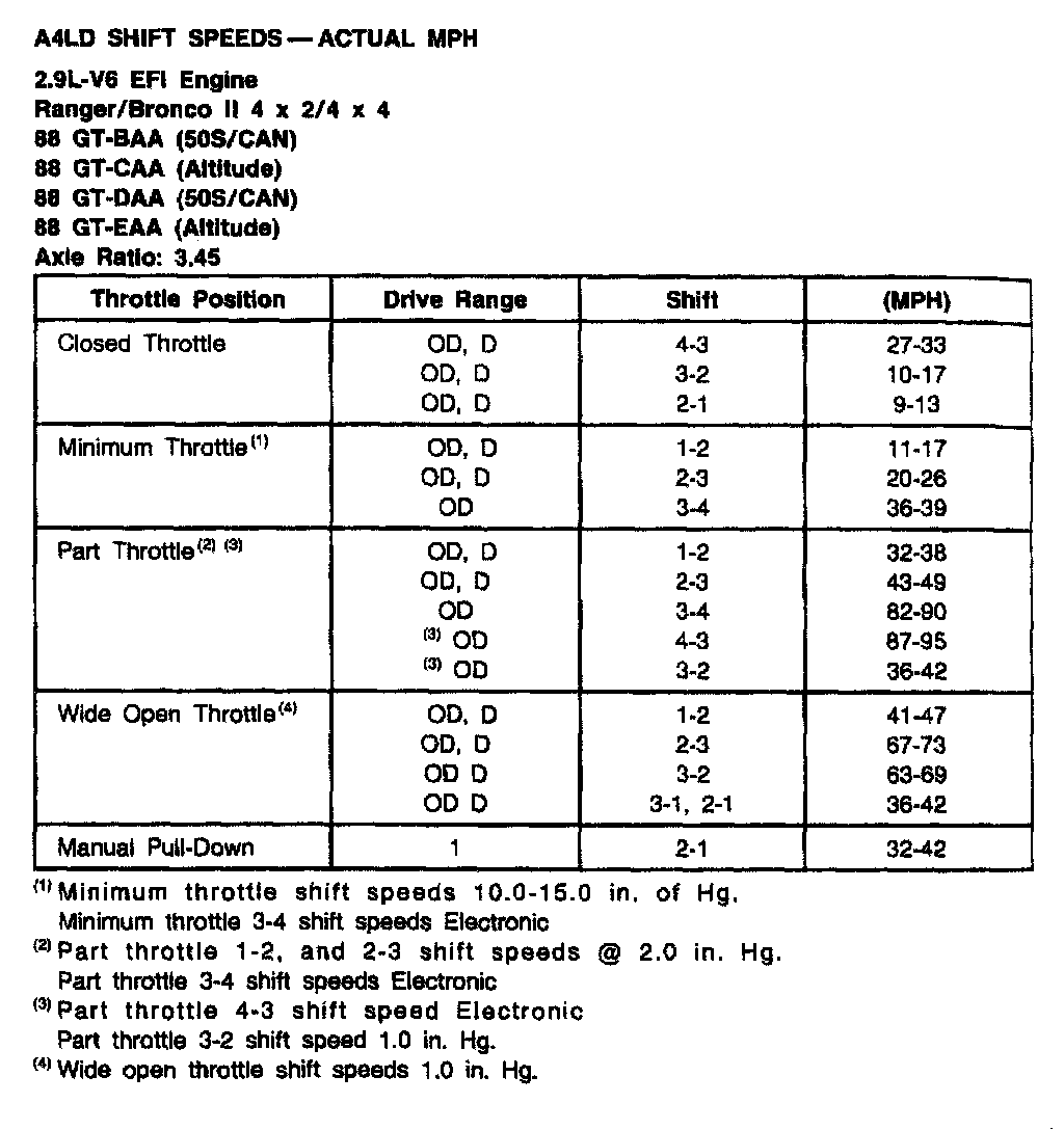 A4LD 4-spd A/T, Shift Speeds (2.9L Ranger/Bronco II):