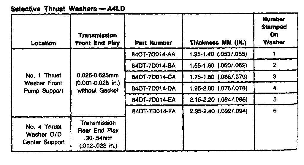 A4LD 4-spd A/T, Front Pump/Thrust O/D Washer End Play: