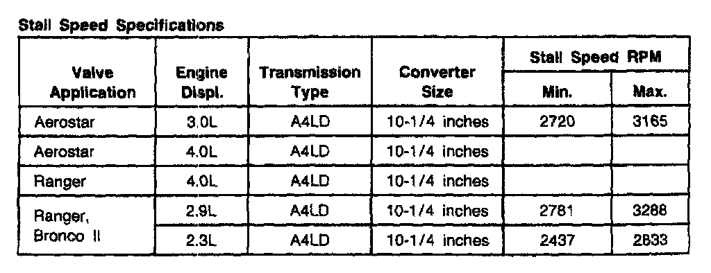 A4LD 4-spd A/T, Stall Speeds/Converter Size (3.0L/4.0L, 2.9/2.3):