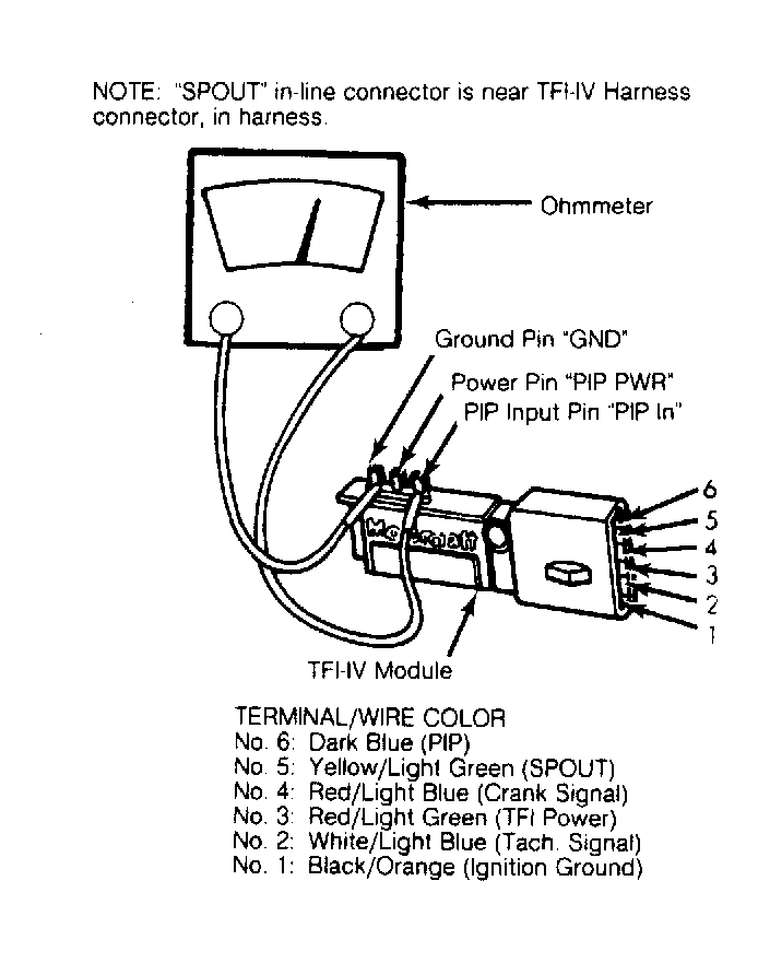 - Measure resistance between TFI-IV module terminals. See Fig 1. Refer to the TFI-IV MODULE RESISTANCE VALUES table.