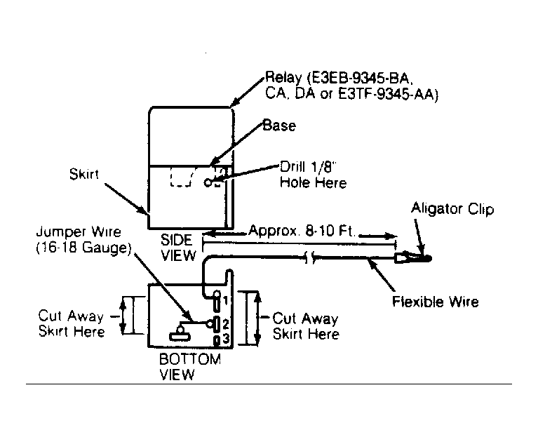 - Using new Relay (E3EB-9345-BA, CA, DA or E3TF-9345-AA), drill a 1/8" hole in-line with pins, and as close to pins as possible. Part of relay skirt may be cut away to provide easier access to pins.