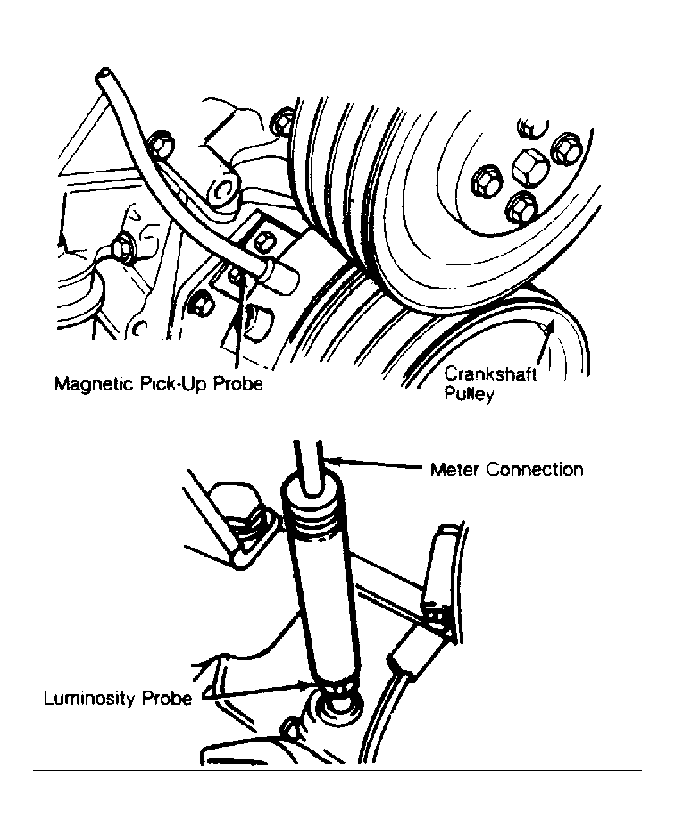 - If readings are incorrect, have dynamic timing meter calibrated at an authorized service center. If readings are correct, stop engine and install magnetic pick-up probe of dynamic timing meter into timing pointer probe hole. See Fig 1 .