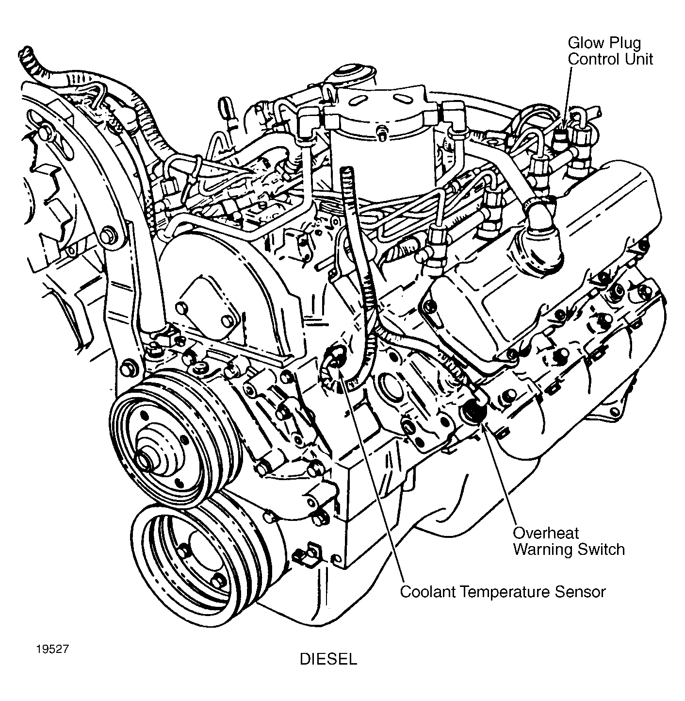 | Glow Plug Controller | On top rear left side of engine. See Figure. |