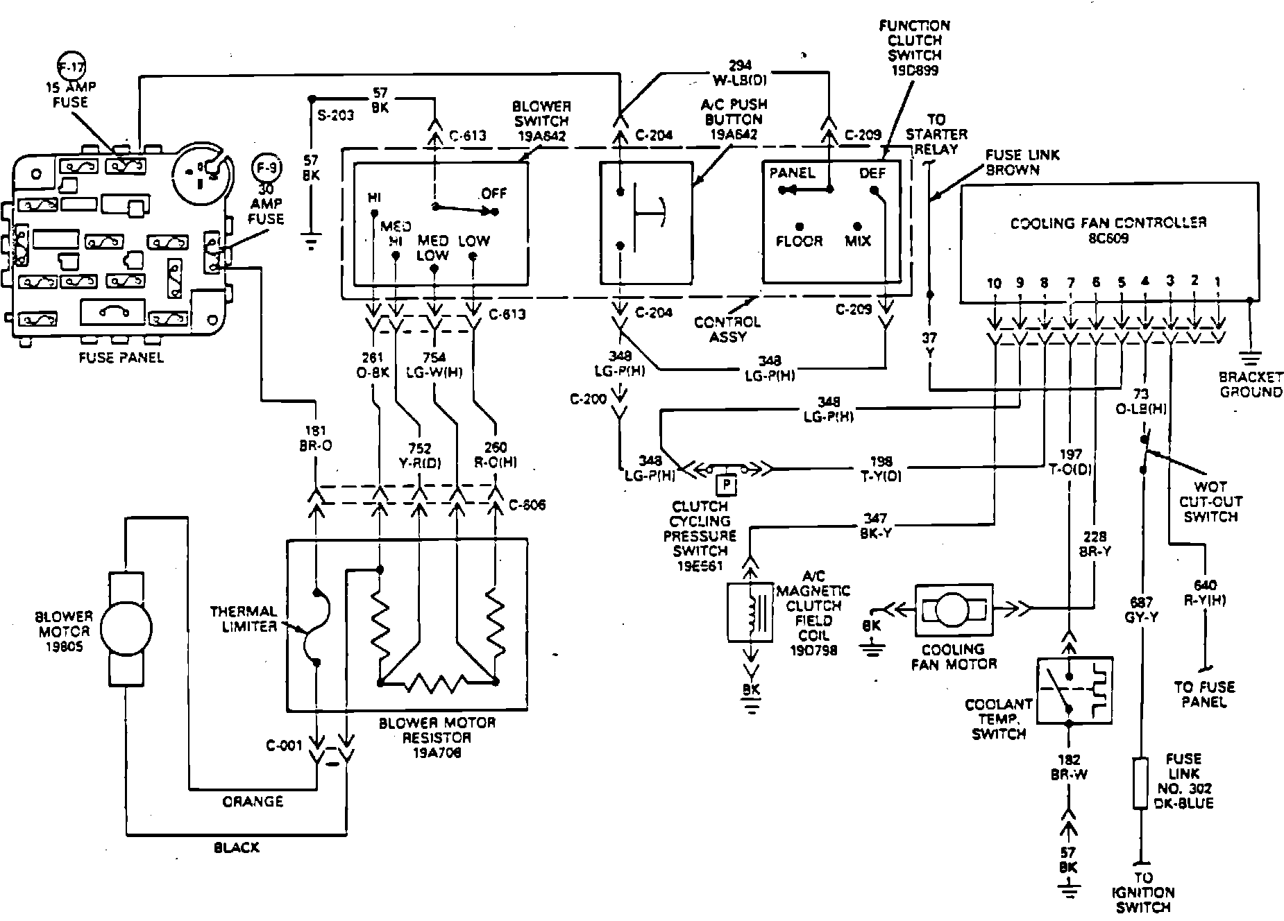 8. Disconnect connector from clutch cycling pressure switch, then install jumper wire across connector. Check for voltage at circuit 198 of cooling fan controller. If voltage is satisfactory, proceed to step 9. If no voltage is present, proceed to step 11.