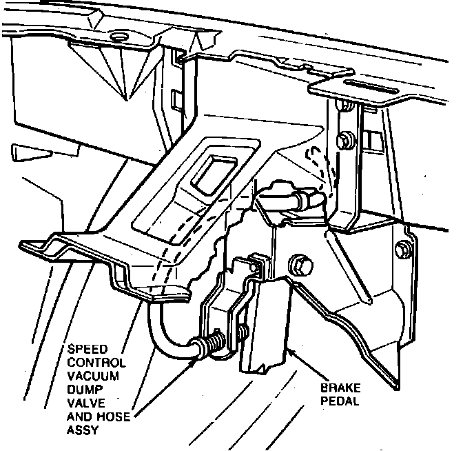 The vacuum dump valve, Fig. 2, provides a safety feature in the system. Normally, when the brake pedal is depressed, an electrical signal from the stop lamps to the ECA will turn off the system. In addition, the vacuum dump valve will mechanically release the vacuum in the servo when the brake pedal is depressed. This releases the throttle independently of the ECA control.