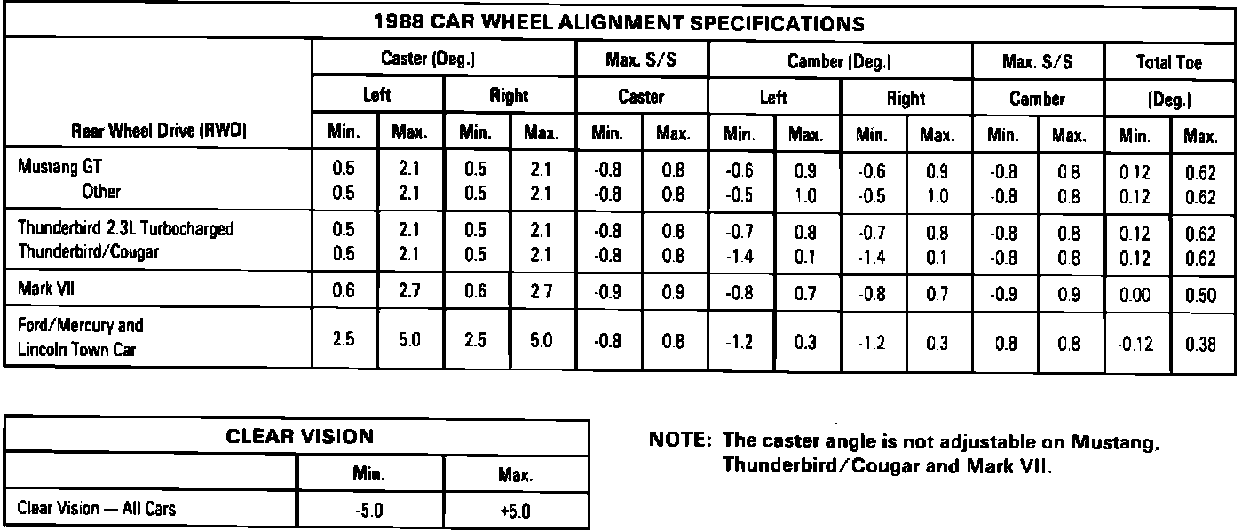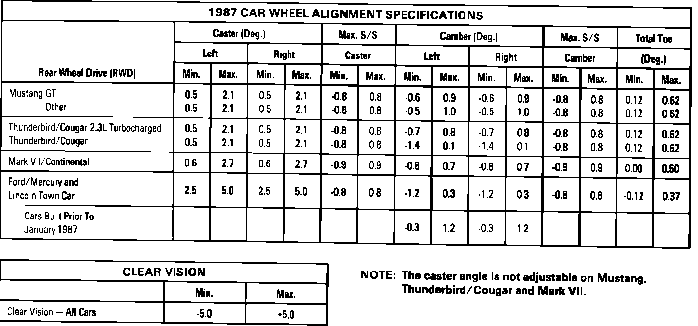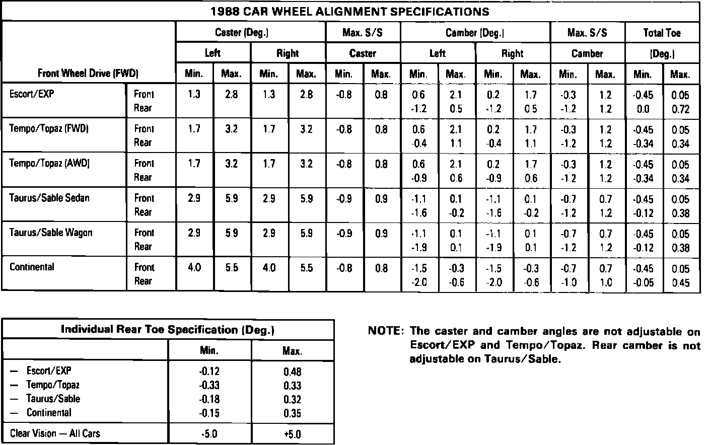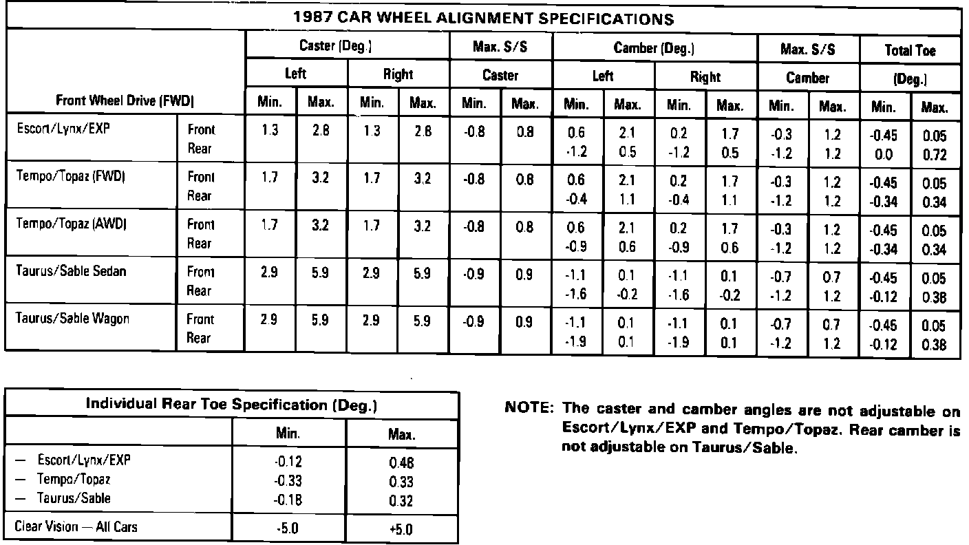 Home >> Ford >> 1987 >> Taurus L4-153 2.5L HSC >> Repair and Diagnosis >> Maintenance >> Alignment >> Technical Service Bulletins >> All Technical Service Bulletins >> Front/Rear Alignment - Specifications
