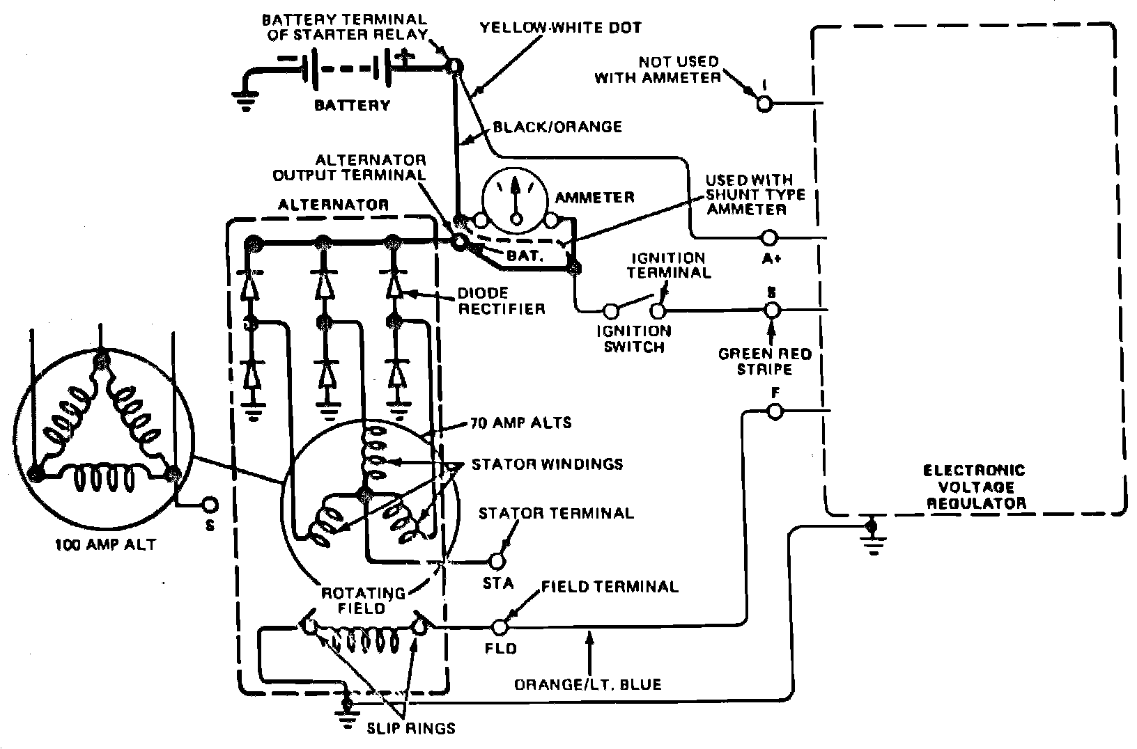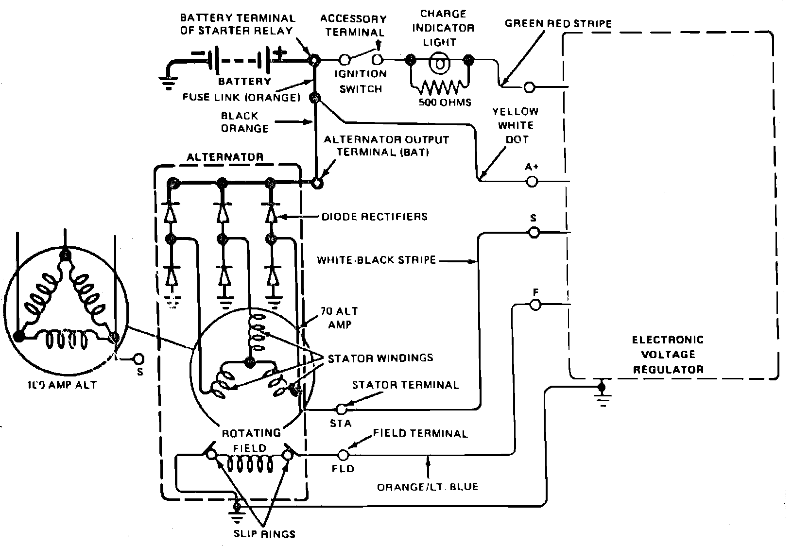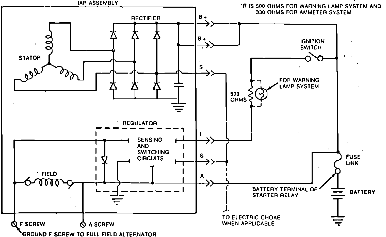4. The systems use a 500 ohm resistor on the rear of the instrument cluster on vehicles equipped with a warning indicator lamp. On systems with an indicator lamp, closing the ignition switch energizes the warning lamp and turns on the regulator output stage. The alternator receives maximum field current and is ready to generate an output voltage. As the alternator rotor speed increases, the output and stator terminal voltages increase from zero to the system regulation level determined by the regulator setting. When the ignition switch is turned off, the solid state relay circuit turns the output stage off, interrupting current flow through the regulator so there is not a current drain on the battery. On vehicles equipped with an ammeter, the operating principle is similar. The ammeter indicates current flow into (charge) or out of (discharge) the vehicle battery.