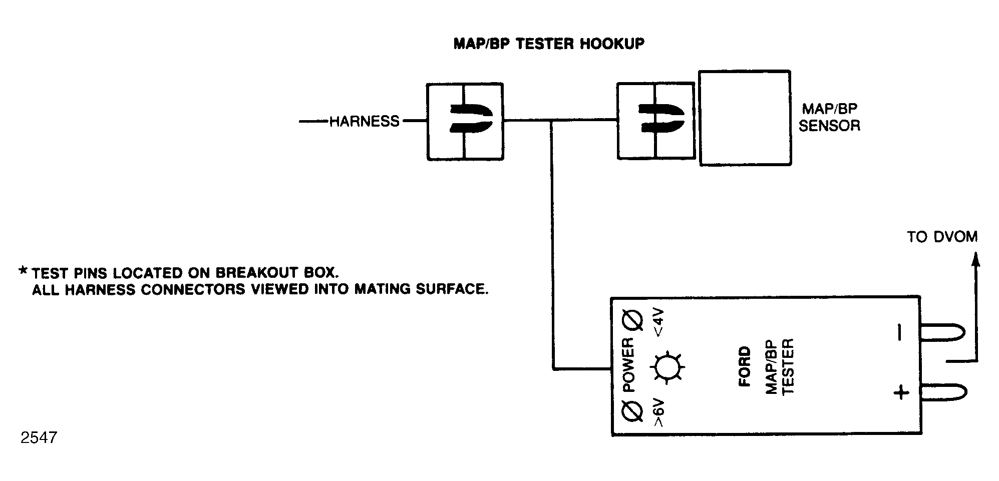 - Turn key off. Disconnect MAP sensor from harness. Connect MAP/BP tester between wiring harness and MAP sensor. Connect banana plugs of tester into DVOM and set DVOM on 20-volt scale. See MAP/BP Tester Hook-Up. Go to next step.