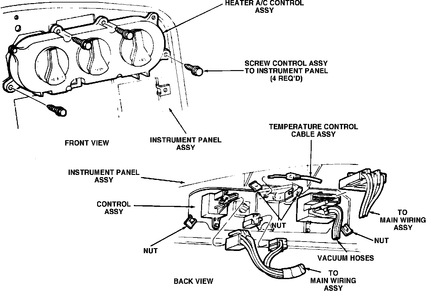 3. Pull control assembly away from instrument panel, then disconnect electrical connectors, vacuum harness and temperature control cable from the assembly.