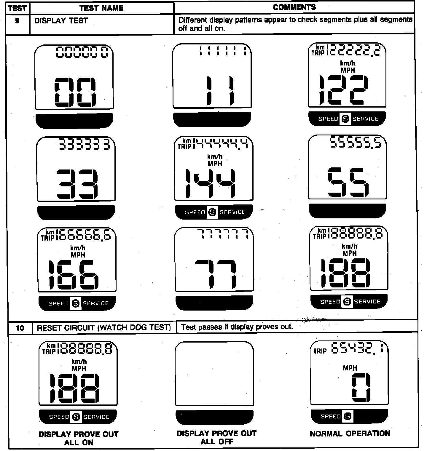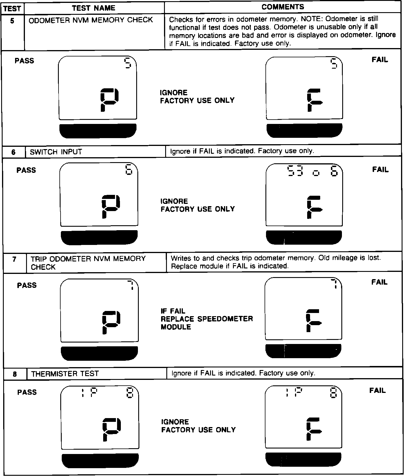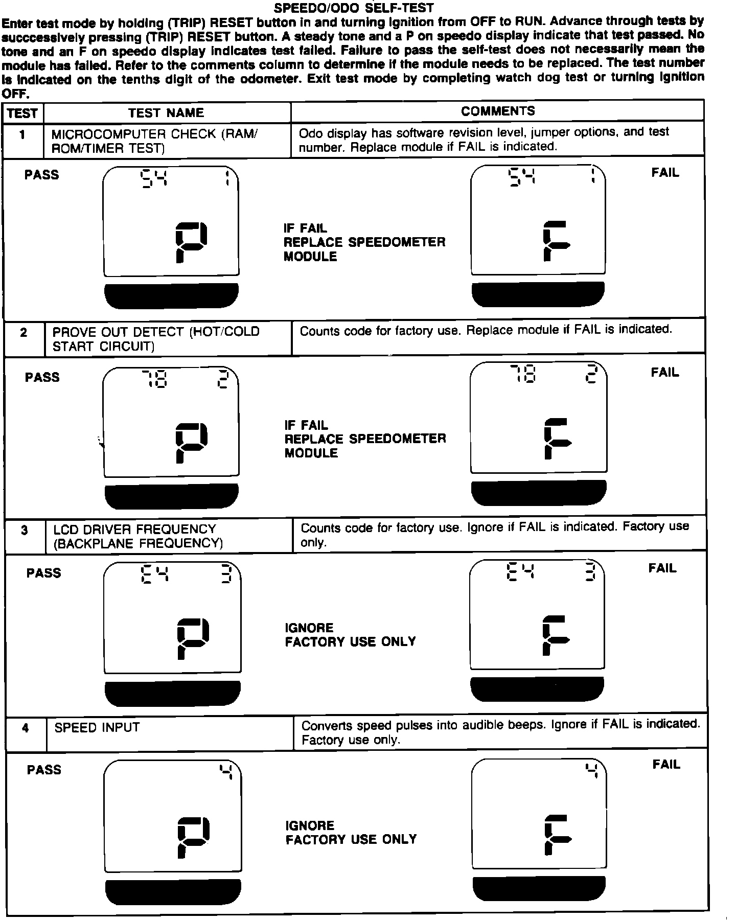 Enter test mode by holding the TRIP RESET button IN and turning ignition from OFF to RUN. Advance through tests by successively pressing the TRIP RESET button. A steady tone and a P on speedometer display indicates that the test passed. No tone and an F on the speedometer display indicates the test has indicated a failure. Failure to pass the self test does not necessarily indicate module failure. Refer to the comments column to determine if the module needs to be replaced. The test number is indicated on the tenths digit of the odometer. Exit test mode by completing watch dog test or turning ignition OFF.