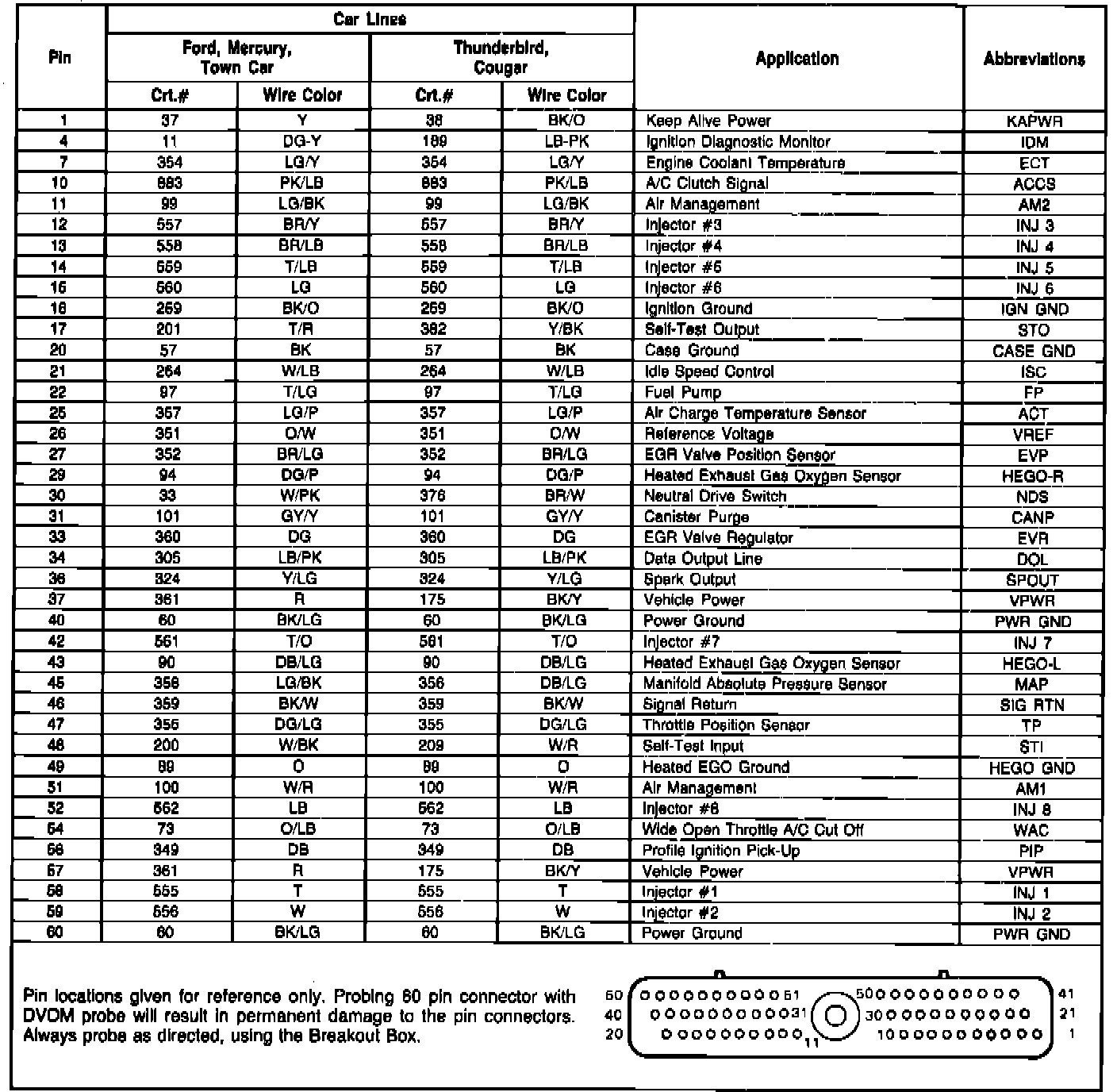 Fig. 319 EEC-IV module connector pin usage. 1987 Ford, Mercury & Lincoln Town Car w/V8-302 SEFI engine: