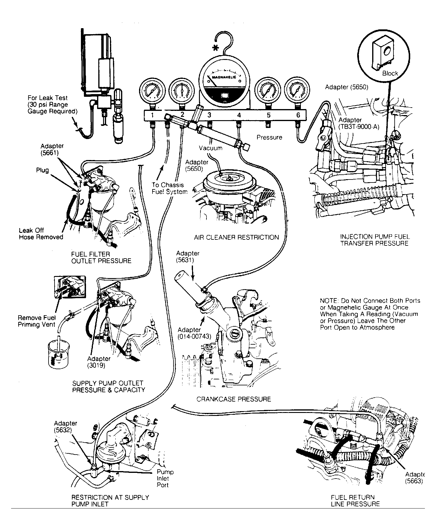 The engine performance diagnostic procedure tests those items which are high frequency, easy to diagnose problems, and progresses to the low frequency, hard to diagnose problems. Proper use of this procedure will provide a rapid as well as accurate diagnosis. Connect Pressure Test Kit (Rotunda 014-00702) to components shown. See Fig 1.