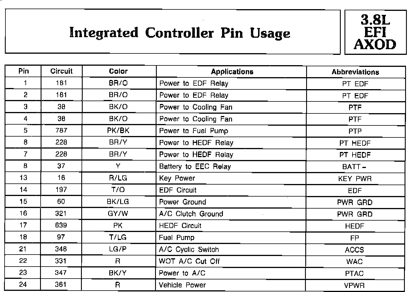 Pin Usage - Integrated Controller W/EFI & AXOD: