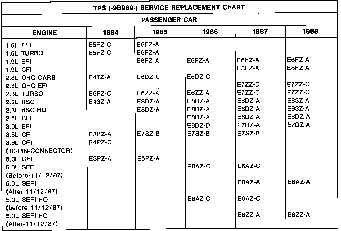 TPS (-9B989-) SERVICE REPLACEMENT CHART