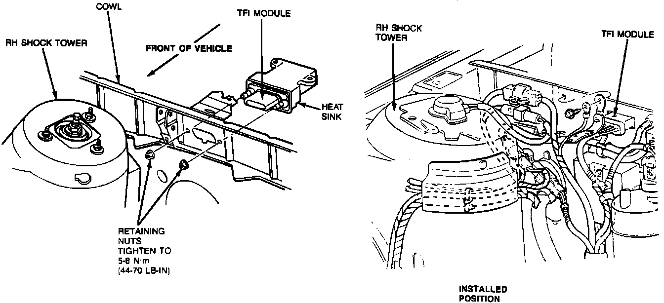 The TFI ignition module is remotely mounted and is located on the RH side of the bulkhead, under the hood. The shorting plug is located near the module towards the center of the bulkhead