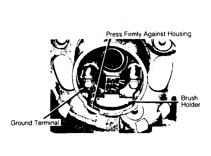 - If rear housing bearing was removed, support housing on inner boss. Press new bearing in housing until it is even with outer end surface. Place brush springs, brushes, brush terminal and terminal insulator in holder.