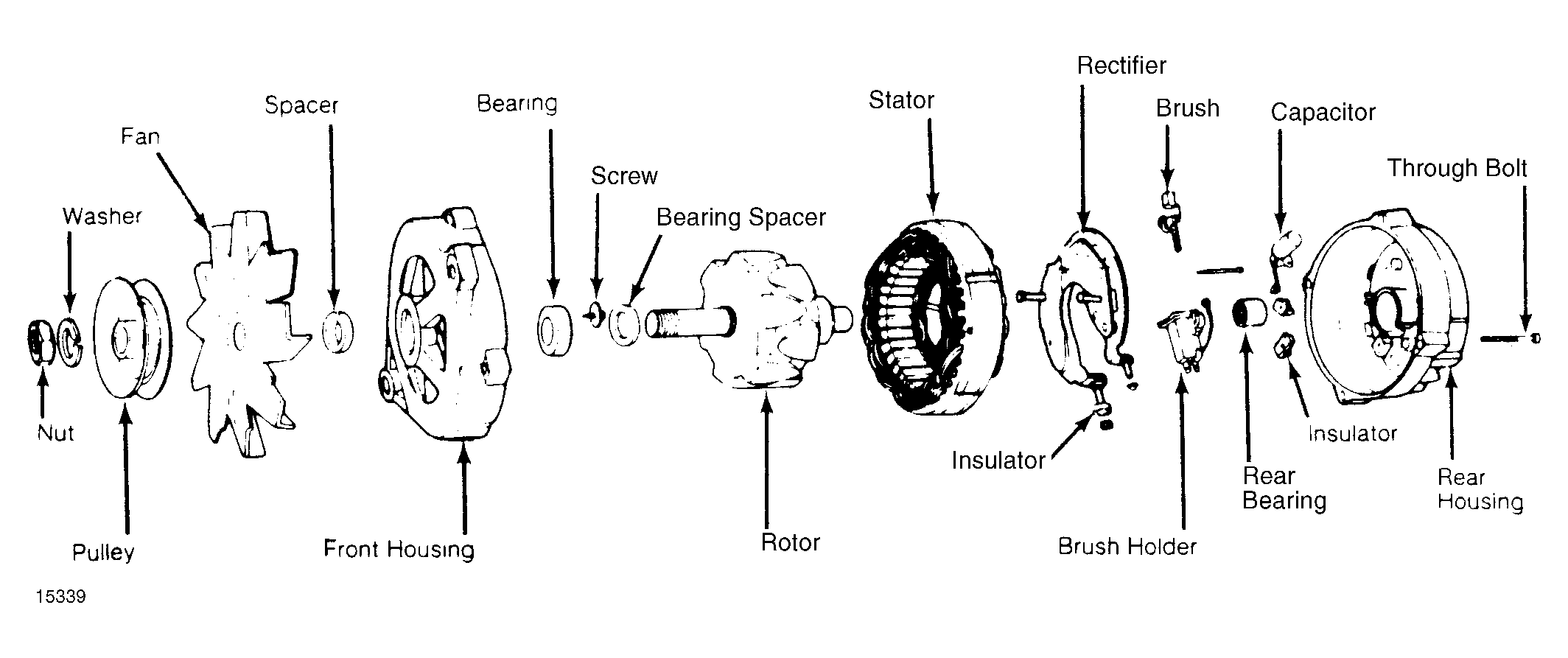 - Mark housings and stator for reassembly. Remove through bolts. Separate front housing with rotor from rear housing and stator. Do not separate rear housing from stator. Remove drive pulley nut, lock washer, pulley, fan and spacer from rotor shaft. See Fig 2.