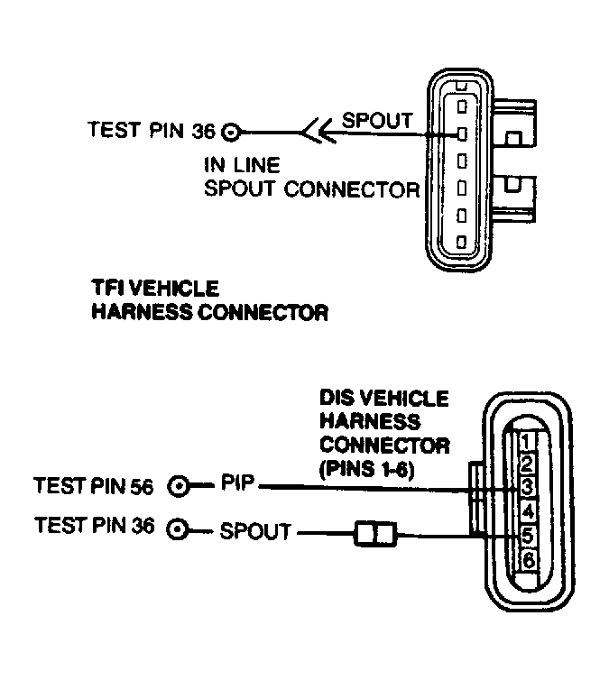 - Check Spout Circuit For Short to Power or Ground. Turn key off and wait 10 seconds. Install breakout box. Disconnect ECA and DIS module. Set DVOM on 200K-ohm scale. Measure resistance between test pin No. 36 at the breakout box and test pins No. 16, 40 and battery positive. If all resistances are greater than 10K ohms, diagnose TFI or DIS ignition system. If resistances are less than 10K ohms, service SPOUT circuit for shorts. Reconnect all components and rerun QUICK TEST.