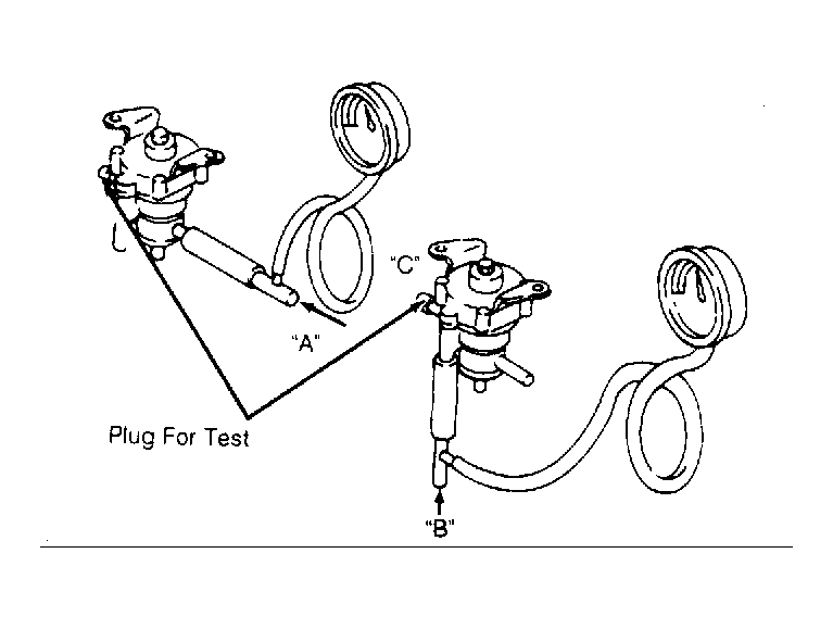 - Remove rollover vent valve and position it horizontally. Tee in a pressure gauge to the hose normally leading to the fuel tank, plug port "C" and blow into port "A". See Fig 1