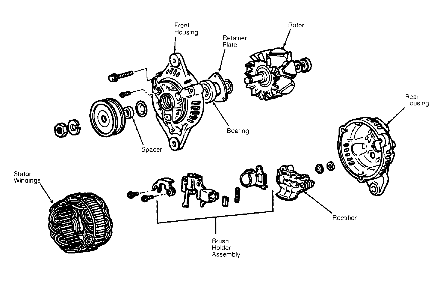 Alternator has an internal fan and Integrated Circuit (IC) electronic voltage regulator. Internal IC electronic voltage regulator is part of the rotor, brush and brush holder. See Figure. Voltage regulator automatically reduces regulated voltage when ambient temperature increases, so battery charging voltage is maintained at the proper level. Charging system voltage is maintained at an operating range of 14.1-14.7 volts. Alternating current is rectified to direct current by 6 diodes. A check engine warning light is used to indicate charging system malfunction.