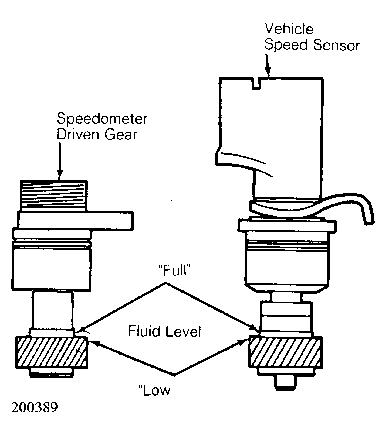To check fluid, remove retaining bolt and pry out speedometer driven gear assembly (analog cluster) or vehicle speed sensor (digital cluster) from transaxle. Wipe fluid from driven gear and housing. Reinsert assembly into transaxle and withdraw again checking fluid level as shown in Fig 1 .