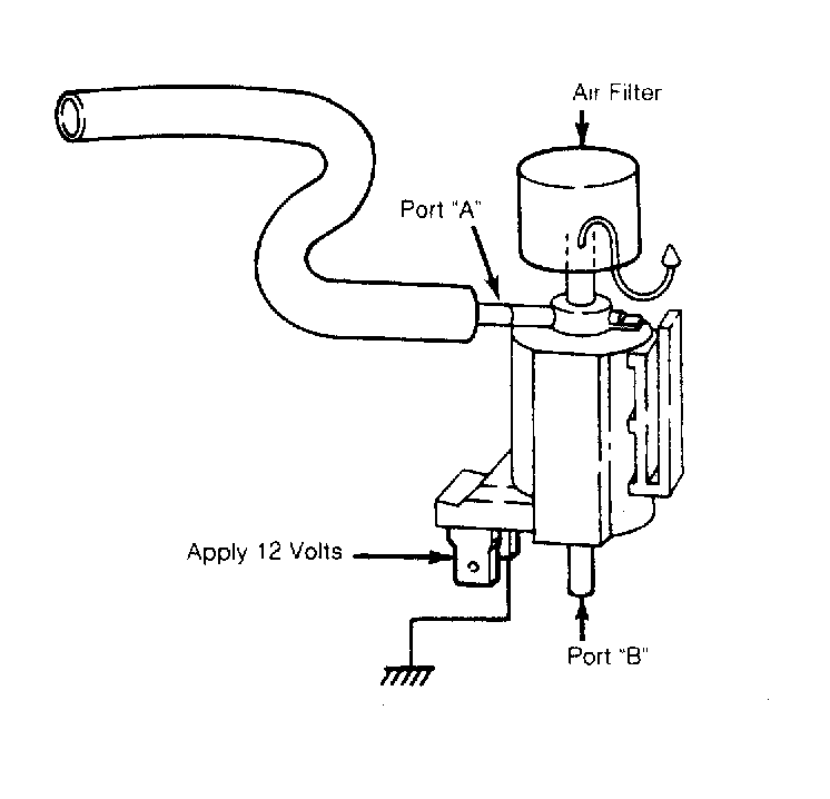 With vacuum hoses and solenoid valve connections disconnected, blow through vacuum hose at port "A" and ensure that air flows from port "B". Apply 12 volts and ground to connections. See Fig 1 . Blow through vacuum hose and verify air flows from the filter. Replace valve if necessary.