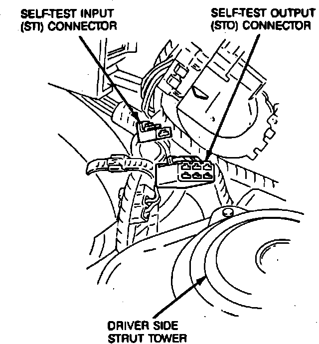 The self-test input (1 pin) connector and the self-test output (6 pin) connector are both used while performing the Quick Test diagnostic procedure with the Super Star Tester II (007-00028) or an analog voltmeter (059-00010). When the self-test input connector is grounded, a signal is sent to the electronic control assembly activating the self-test mode. The self-test output connector is used for retrieving service codes stored from resulting faults while the vehicle was in normal operation. Both connectors are located in the engine compartment behind the driver's side strut tower, Fig. 12.
