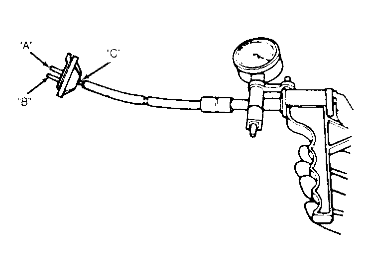 Remove valve from vehicle. Apply 2.6-4.2 in Hg. of vacuum to port "C". See Fig 1 . Ensure that vacuum holds at port "C" and that air will flow through ports "A" and "B". Replace canister purge valve if necessary.