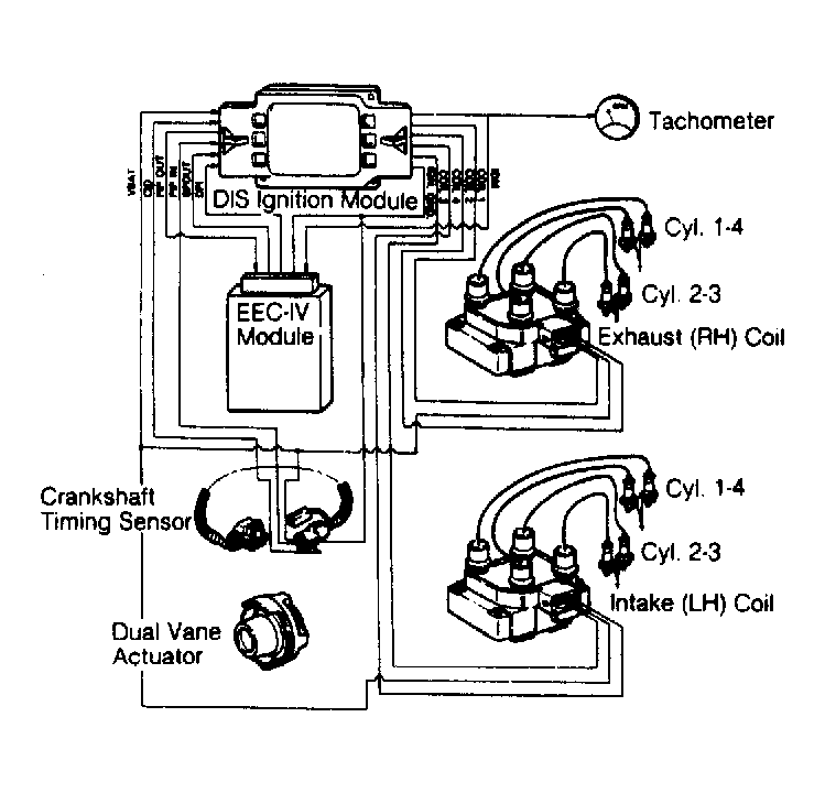In the Distributorless Ignition System (DIS), engine timing and spark distribution is handled electronically with no moving parts. During basic operation, the EEC-IV processor determines the ignition timing and the DIS module determines which ignition coil to fire.