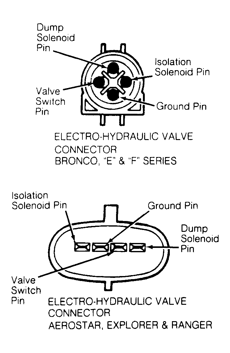 - If resistance is greater than 6 ohms, reconnect module connector. On Bronco, "E" and "F" Series, disconnect electro-hydraulic valve connector. On all others, go to step 4). On Bronco, "E" and "F" Series, measure resistance between ground pin (harness side) and ground. See Fig 1