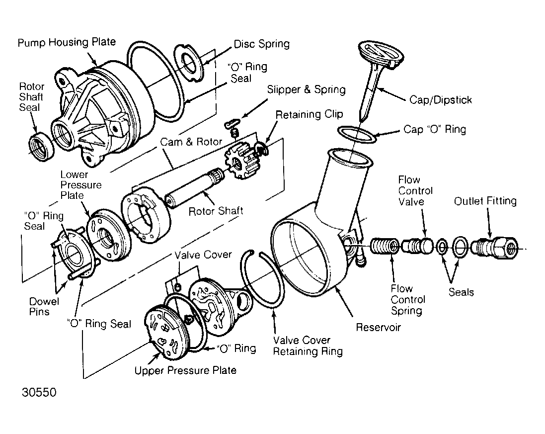 C-II power steering pump is a belt-driven, slipper-type integral pump with a fiberglass/nylon reservoir. Reservoir is attached to rear of pump housing plate. See Figure . Pump body is encased within housing and reservoir.