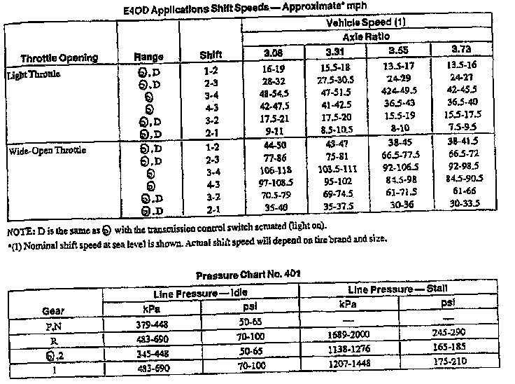 E4OD 4-spd A/T, Shift Speeds/Line Pressures: