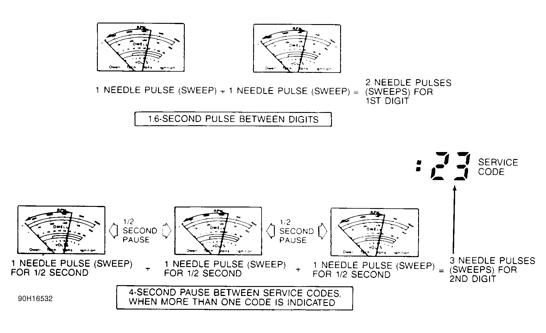 Codes are displayed in the form of timed pulses and read by the technician on a voltmeter or STAR tester. When using analog volt/ohmmeter, codes are displayed in the form of needle sweeps on the volt/ohmmeter. See Fig 1 .