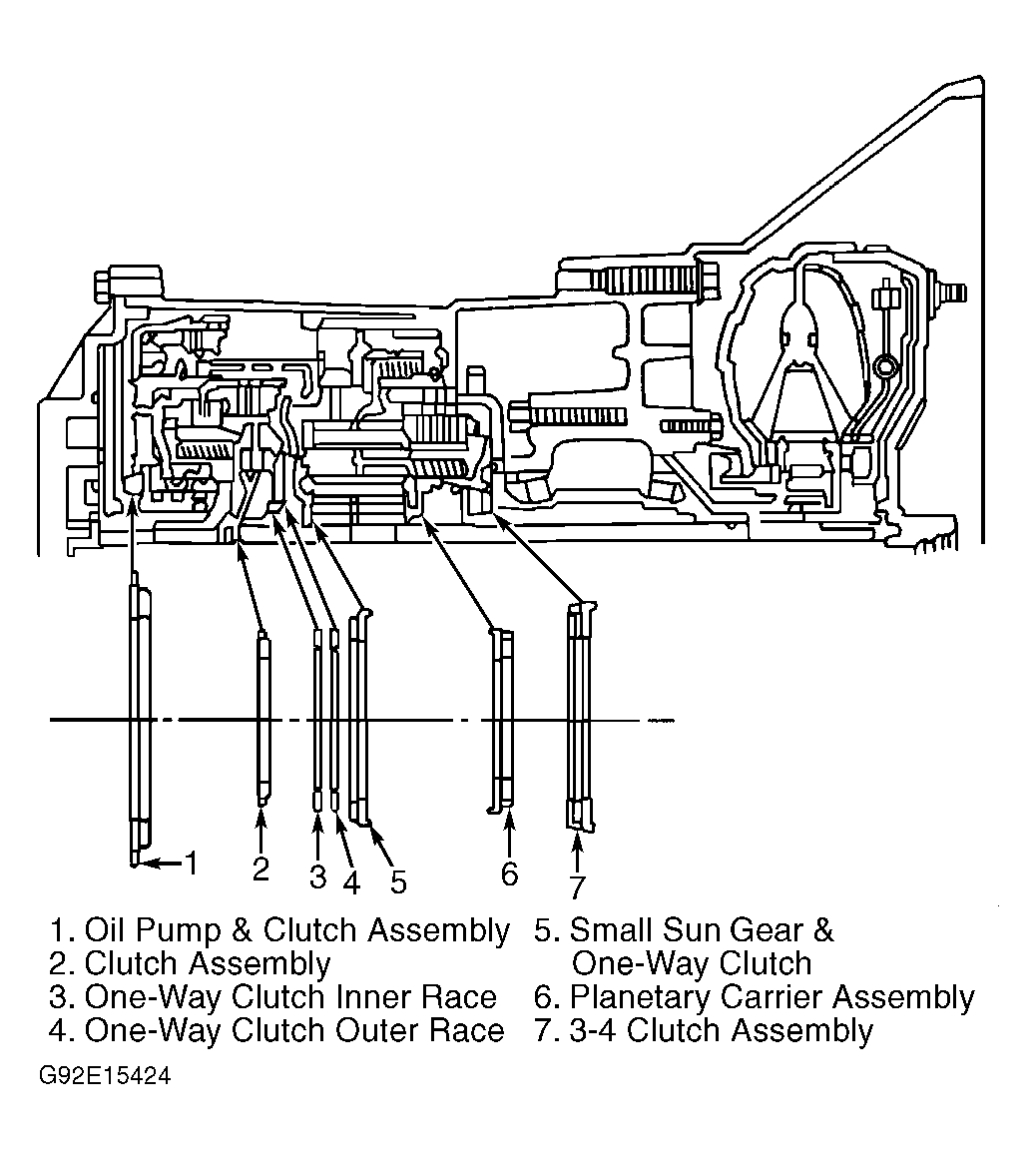 9. With thrust washer and needle bearing correctly positioned, install 3-4 clutch and turbine shaft assembly into case. See Fig 2 . Install internal gear and snap ring.