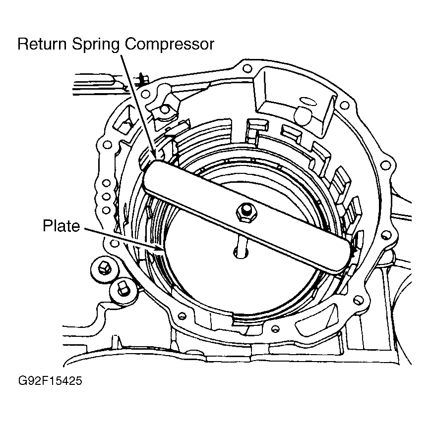 5. Install return spring and retainer. Compress return spring and retainer using Spring Compressor (T88C-77000-AH) and Plate (T87C-77000-B). See Fig 1 . Install snap ring. Remove spring compressor.