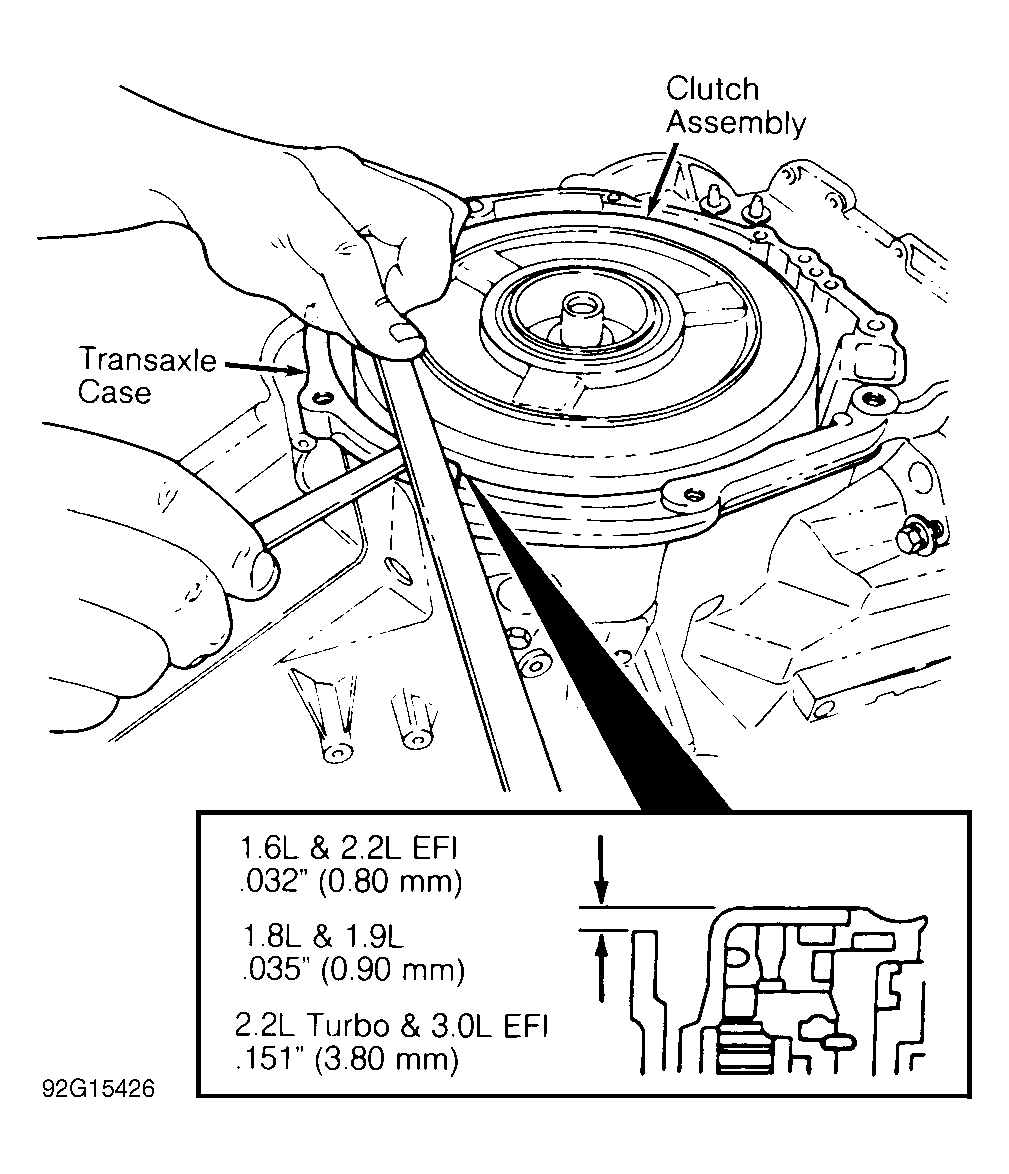 16. Install clutch assembly by rotating. Measure height difference between reverse and forward drum and case. Height difference should be .032" (.80 mm) for 1.6L and 2.2L EFI models, .035" (.90 mm) for 1.8L & 1.9L models and .151" (3.80 mm) for 2.2L turbo and 3.0L EFI models. See Fig 3 .