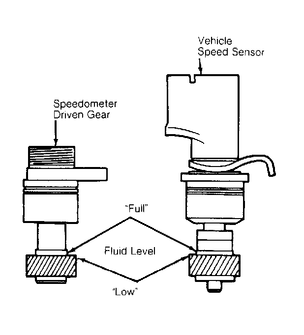 Ensure vehicle is level. To check fluid, remove retaining bolt and pry out speedometer driven gear assembly (analog cluster) or vehicle speed sensor (digital cluster) from transaxle. Wipe fluid from driven gear and housing. Reinsert assembly into transaxle and withdraw again checking fluid level as shown in Fig 1 .