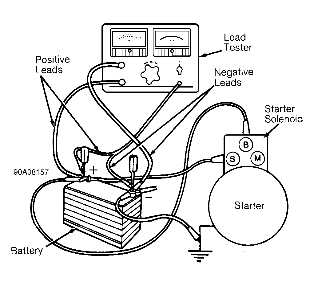 - Connect jumper wire between negative battery terminal and starter frame. Connect another jumper wire between positive battery terminal and positive terminal of starter motor. Ensure no current is flowing through ammeter.
