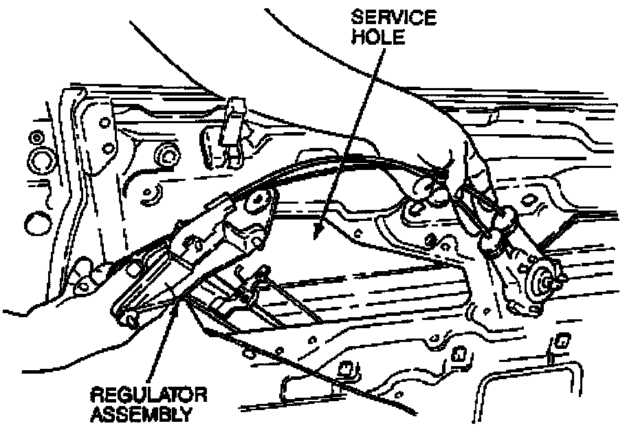 8. Remove the six window regulator-to-door retaining nuts. Disconnect the electric motor wire connector and remove the regulator assembly through the service hole.