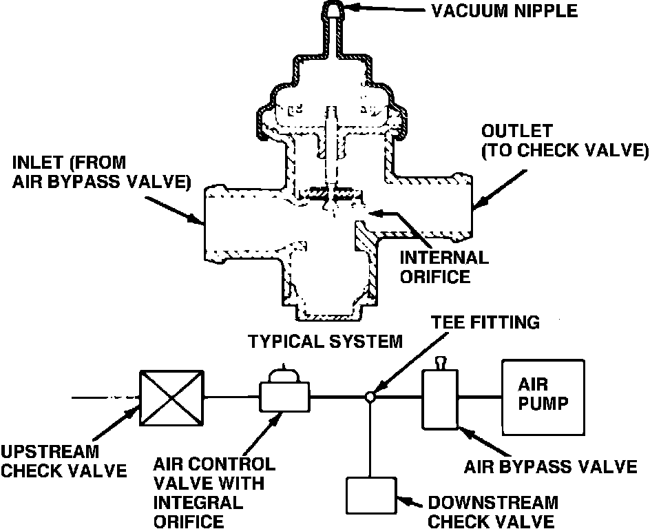 2. Run engine at 1500 RPM and disconnect air supply hose at valve outlet and the vacuum hose at vacuum nipple. There should be air flow at valve outlet.