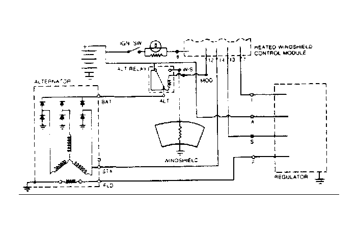 Current is supplied from the alternator/regulator system to rotating field of alternator through 2 brushes and 2 slip rings. Power is produced in the form of alternating current and is rectified to direct current by 6 diodes. See Fig 1 & 2. If equipped, the heated windshield and heated windshield control module are components of the charging system. See Figure.