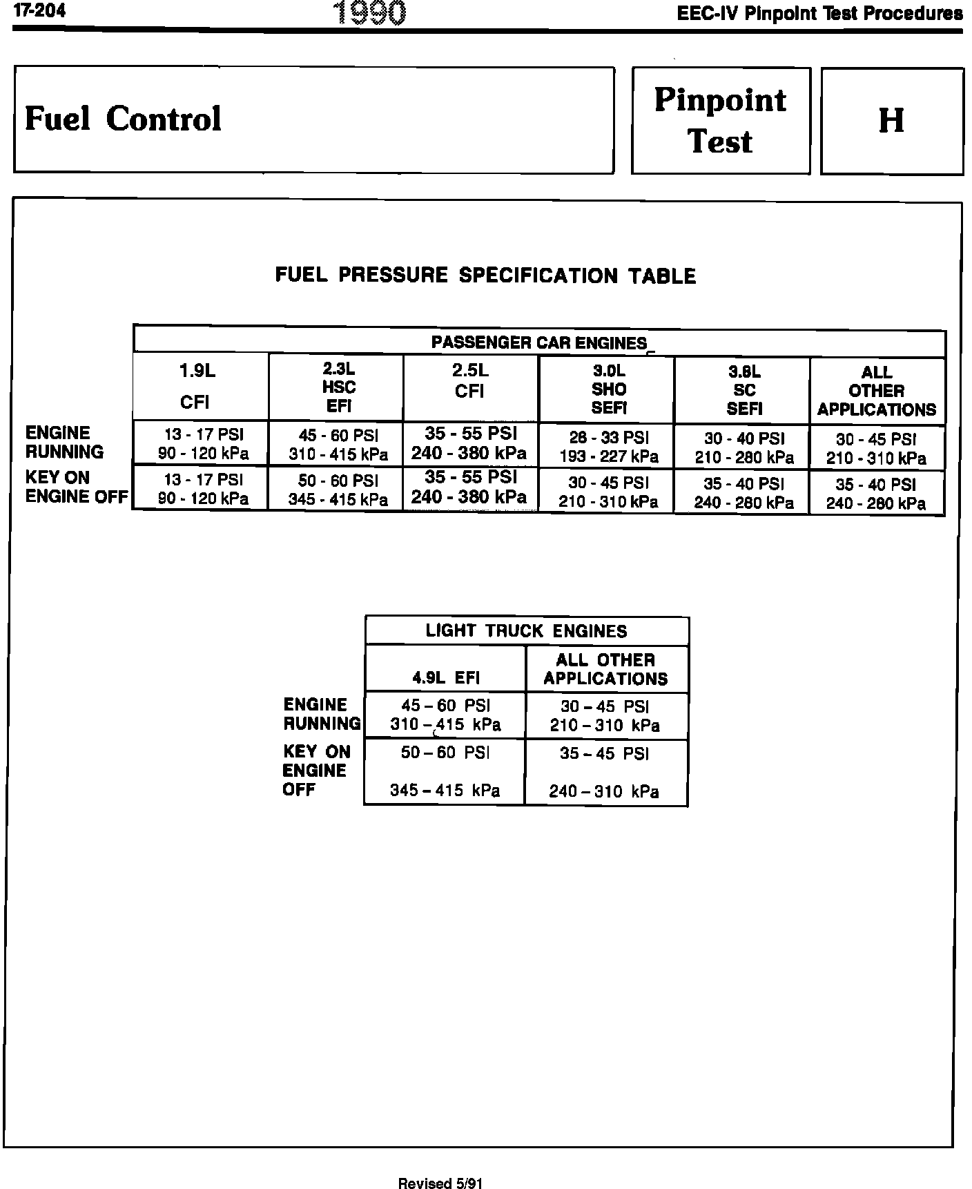 H - Fuel Pressure Specification Table