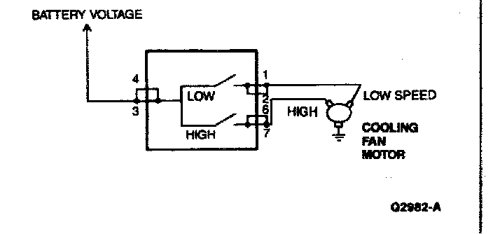 The Low Fan Control (LFC) relay controls the electric cooling fan. The primary control circuit of the LFC relay is normally high (B+). In this state the low speed cooling fan runs continuously. The PCM grounds this circuit, pulling it low near zero volts, to turn the fan off. This "fail safe" is built into the fan control circuit to run the fan anytime the EEC power relay is activated if the PCM should fail open circuit.