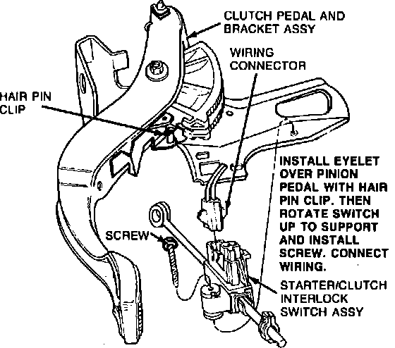 3. Remove panel above clutch pedal, then disconnect starter/clutch interlock switch wiring.