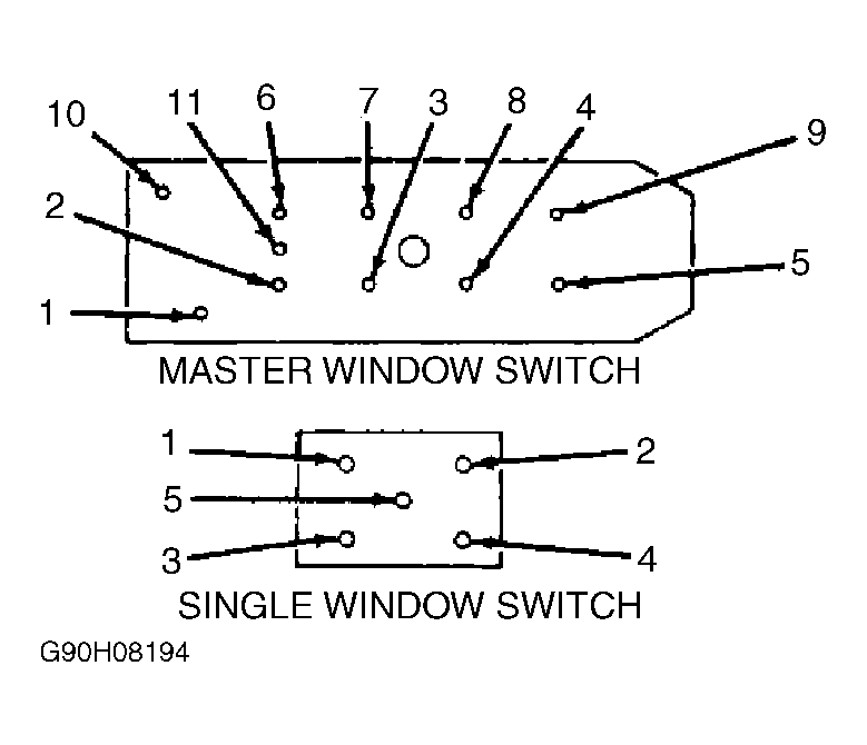 - Press raised portion of rocker switch (closed position). Continuity should exist between terminals No. 1 and 5 and terminals No. 3 and 4. Terminal No. 2 should not have continuity with any other terminal.