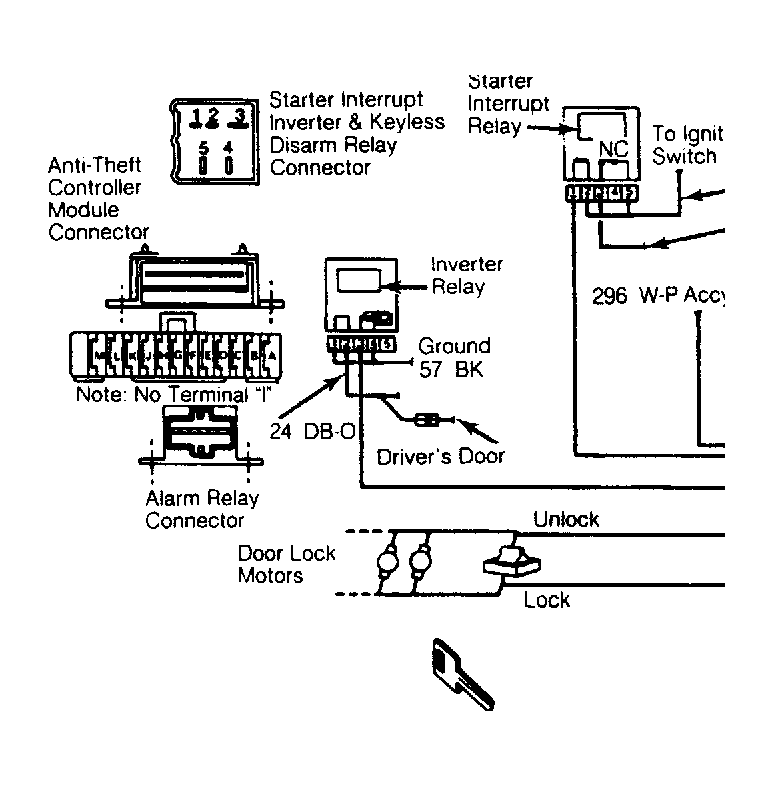 - On Continental and Mark VII, check voltage at terminal "E", circuit No. 342 (Light Green/Purple) wire of control module. If reading is less than 2 volts, replace starter interrupt relay or check for open in circuits No. 33 (White/Pink) wire or No. 342 (Light Green/Purple) wire. If reading is greater than 2 volts, replace control module and retest system. On Town Car, disconnect alarm module from wiring harness and attempt to start vehicle. If vehicle starts, go to step 7). If vehicle will not start, replace control module and retest.