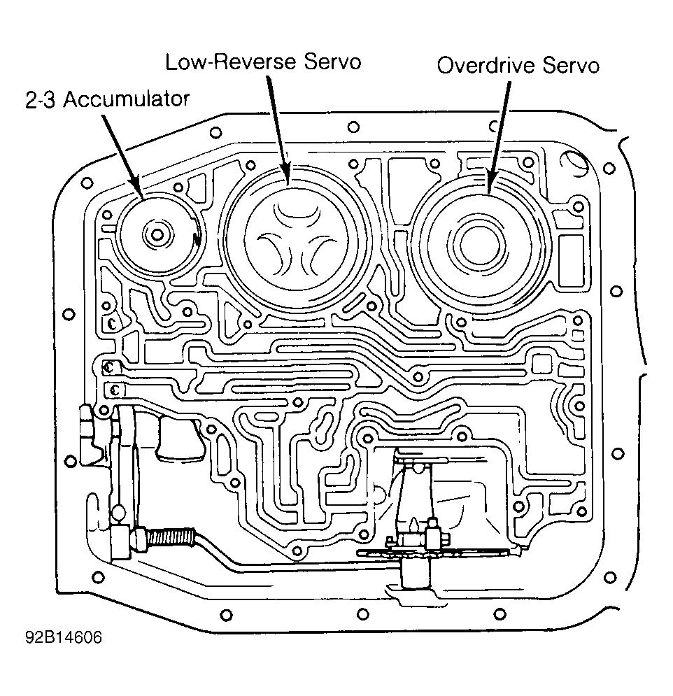 - Remove valve body, see VALVE BODY ASSEMBLY . Depress low-reverse servo piston cover and remove retaining snap ring and cover. See Figure .