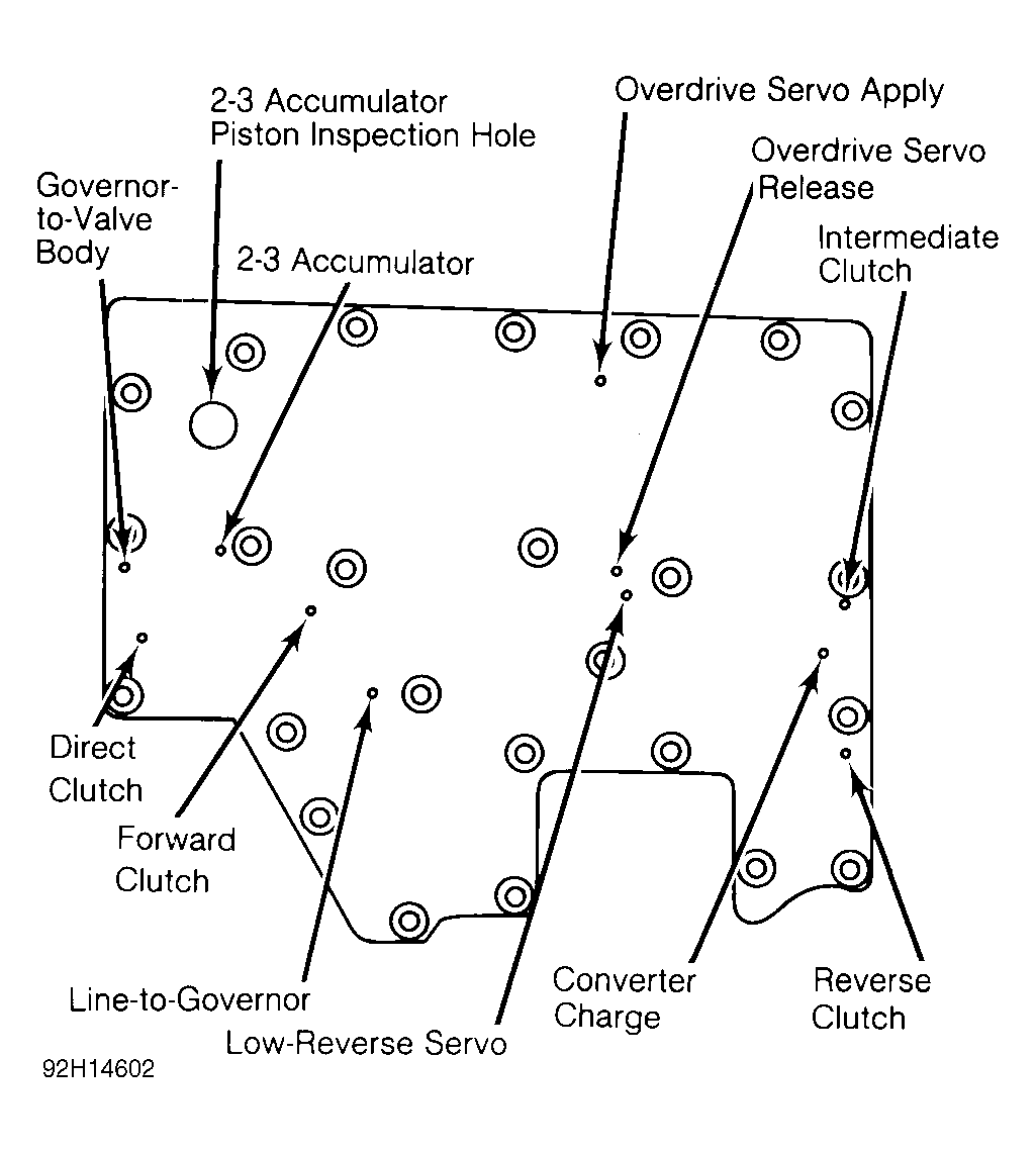 - Remove piston and spring from case by applying compressed air to low-reverse servo release passage in case. See Figure . Cover piston pocket to prevent piston from falling out of case. Using Remover (T80L-77030-B), apply air to servo piston release passage to remove piston, if necessary.